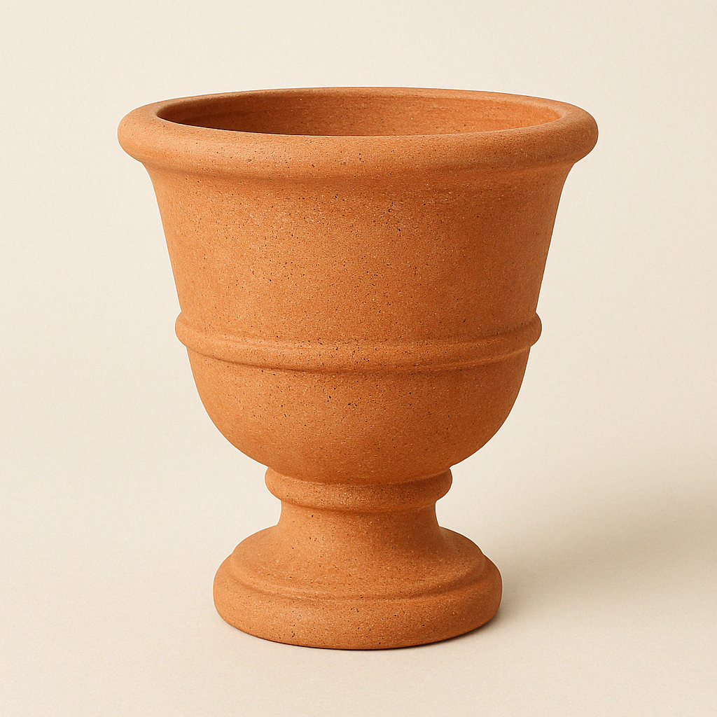 La maceta tipo urna es un elemento decorativo con mucha personalidad. Su diseño elevado sobre pedestal la convierte en una opción ideal para destacar plantas ornamentales o flores de temporada. Fabricada en terracota natural sin esmaltar, mantiene la humedad y oxigenación del sustrato. Perfecta para entradas, terrazas o zonas ajardinadas que buscan un toque de distinción.